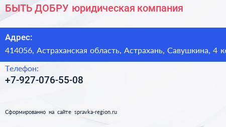 БЫТЬ ДОБРУ, юридическая компания по адресу 414056, Астраханская область, Астрахань, Савушкина, 4 к6 в дальнейшем Организация, размещена в следующих категориях: