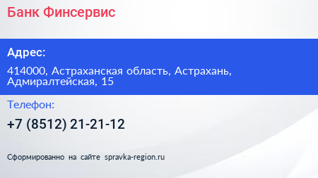 Банк Финсервис по адресу 414000, Астраханская область, Астрахань, Адмиралтейская, 15 в дальнейшем Организация, размещена в следующих категориях: