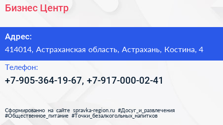 Бизнес-Центр по адресу 414014, Астраханская область, Астрахань, Костина, 4 в дальнейшем Организация, размещена в следующих категориях: