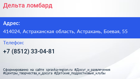 Дельта, ломбард по адресу 414024, Астраханская область, Астрахань, Боевая, 55 в дальнейшем Организация, размещена в следующих категориях: