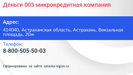 Деньги 003, микрокредитная компания по адресу 414040, Астраханская область, Астрахань, Вокзальная площадь, 20ж в дальнейшем Организация, размещена в следующих категориях: