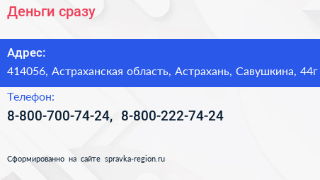 Деньги сразу по адресу 414056, Астраханская область, Астрахань, Савушкина, 44г в дальнейшем Организация, размещена в следующих категориях: