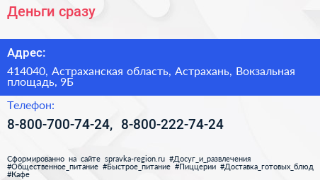 Деньги сразу по адресу 414040, Астраханская область, Астрахань, Вокзальная площадь, 9Б в дальнейшем Организация, размещена в следующих категориях: