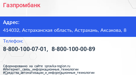 Газпромбанк по адресу 414032, Астраханская область, Астрахань, Аксакова, 8 в дальнейшем Организация, размещена в следующих категориях: