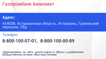 Газпромбанк, банкомат по адресу 414038, Астраханская область, Астрахань, Грановский переулок, 59д в дальнейшем Организация, размещена в следующих категориях: