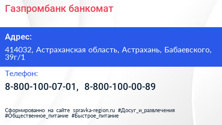 Газпромбанк, банкомат по адресу 414032, Астраханская область, Астрахань, Бабаевского, 39г/1 в дальнейшем Организация, размещена в следующих категориях: