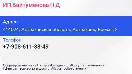 ИП Байтуменова Н.Д. по адресу 414024, Астраханская область, Астрахань, Боевая, 2 в дальнейшем Организация, размещена в следующих категориях: