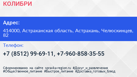 КОЛИБРИ по адресу 414000, Астраханская область, Астрахань, Челюскинцев, 82 в дальнейшем Организация, размещена в следующих категориях: