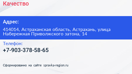 Качество+ по адресу 414014, Астраханская область, Астрахань, улица Набережная Приволжского затона, 14 в дальнейшем Организация, размещена в следующих категориях: