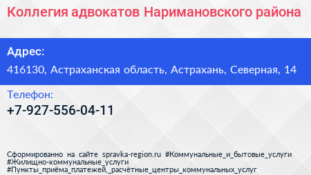 Коллегия адвокатов Наримановского района по адресу 416130, Астраханская область, Астрахань, Северная, 14 в дальнейшем Организация, размещена в следующих категориях: