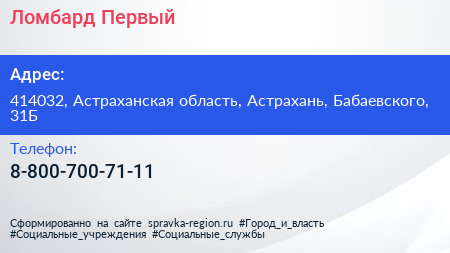 Ломбард Первый по адресу 414032, Астраханская область, Астрахань, Бабаевского, 31Б в дальнейшем Организация, размещена в следующих категориях:
