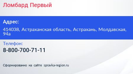 Ломбард Первый по адресу 414038, Астраханская область, Астрахань, Молдавская, 94а в дальнейшем Организация, размещена в следующих категориях:
