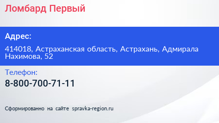 Ломбард Первый по адресу 414018, Астраханская область, Астрахань, Адмирала Нахимова, 52 в дальнейшем Организация, размещена в следующих категориях: