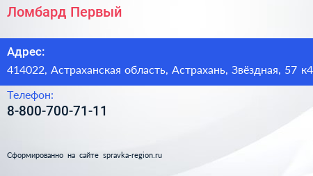 Ломбард Первый по адресу 414022, Астраханская область, Астрахань, Звёздная, 57 к4 в дальнейшем Организация, размещена в следующих категориях: