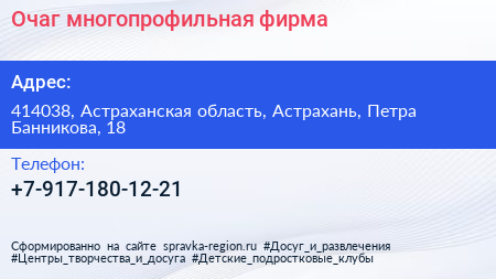 Очаг, многопрофильная фирма по адресу 414038, Астраханская область, Астрахань, Петра Банникова, 18 в дальнейшем Организация, размещена в следующих категориях: