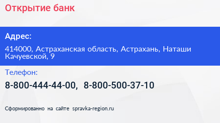 Открытие, банк по адресу 414000, Астраханская область, Астрахань, Наташи Качуевской, 9 в дальнейшем Организация, размещена в следующих категориях: