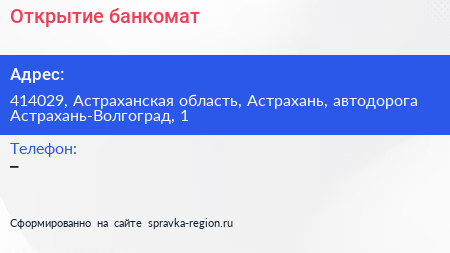 Открытие, банкомат по адресу 414029, Астраханская область, Астрахань, автодорога Астрахань-Волгоград, 1 в дальнейшем Организация, размещена в следующих категориях: