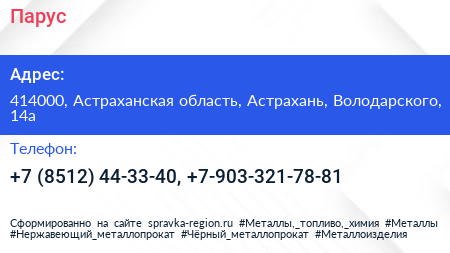 Парус по адресу 414000, Астраханская область, Астрахань, Володарского, 14а в дальнейшем Организация, размещена в следующих категориях: