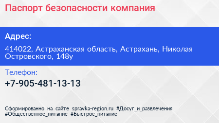 Паспорт безопасности, компания по адресу 414022, Астраханская область, Астрахань, Николая Островского, 148у в дальнейшем Организация, размещена в следующих категориях:
