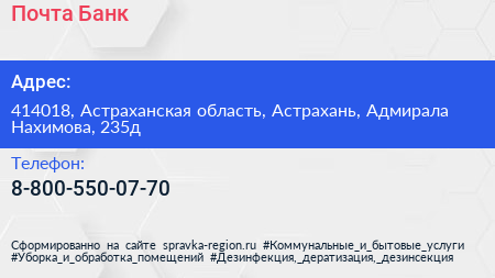 Почта Банк по адресу 414018, Астраханская область, Астрахань, Адмирала Нахимова, 235д в дальнейшем Организация, размещена в следующих категориях: