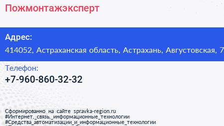 Пожмонтажэксперт по адресу 414052, Астраханская область, Астрахань, Августовская, 7 в дальнейшем Организация, размещена в следующих категориях:
