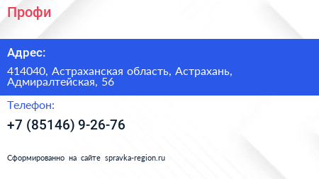 Профи по адресу 414040, Астраханская область, Астрахань, Адмиралтейская, 56 в дальнейшем Организация, размещена в следующих категориях: