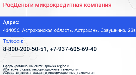 РосДеньги, микрокредитная компания по адресу 414056, Астраханская область, Астрахань, Савушкина, 23в в дальнейшем Организация, размещена в следующих категориях: