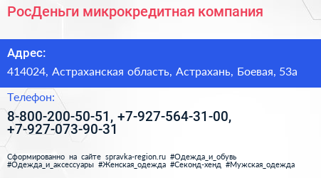 РосДеньги, микрокредитная компания по адресу 414024, Астраханская область, Астрахань, Боевая, 53а в дальнейшем Организация, размещена в следующих категориях: