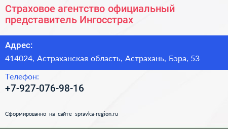 Страховое агентство, официальный представитель Ингосстрах по адресу 414024, Астраханская область, Астрахань, Бэра, 53 в дальнейшем Организация, размещена в следующих категориях: