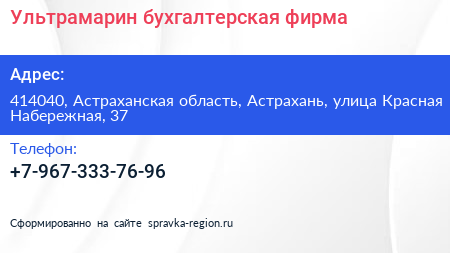 Ультрамарин, бухгалтерская фирма по адресу 414040, Астраханская область, Астрахань, улица Красная Набережная, 37 в дальнейшем Организация, размещена в следующих категориях: