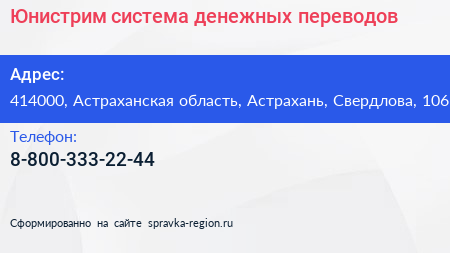 Юнистрим, система денежных переводов по адресу 414000, Астраханская область, Астрахань, Свердлова, 106 в дальнейшем Организация, размещена в следующих категориях: