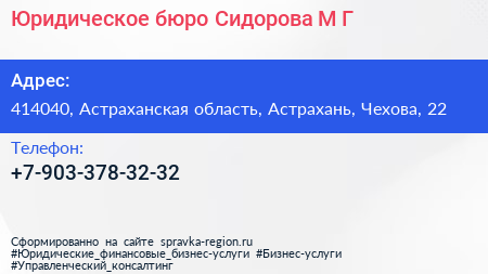 Юридическое бюро Сидорова М.Г. по адресу 414040, Астраханская область, Астрахань, Чехова, 22 в дальнейшем Организация, размещена в следующих категориях: