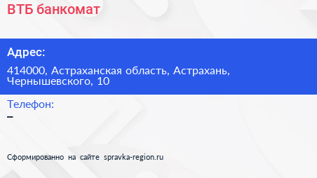 ВТБ, банкомат по адресу 414000, Астраханская область, Астрахань, Чернышевского, 10 в дальнейшем Организация, размещена в следующих категориях: