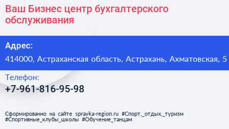 Ваш Бизнес, центр бухгалтерского обслуживания по адресу 414000, Астраханская область, Астрахань, Ахматовская, 5 в дальнейшем Организация, размещена в следующих категориях: