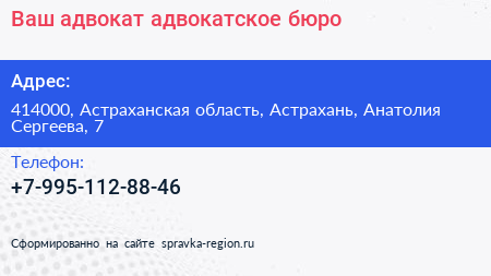 Ваш адвокат, адвокатское бюро по адресу 414000, Астраханская область, Астрахань, Анатолия Сергеева, 7 в дальнейшем Организация, размещена в следующих категориях: