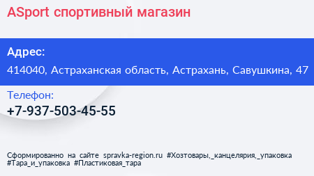 ASport, спортивный магазин по адресу 414040, Астраханская область, Астрахань, Савушкина, 47 в дальнейшем Организация, размещена в следующих категориях: