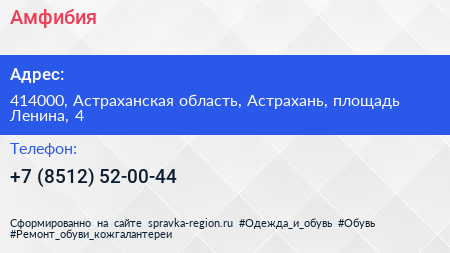 Амфибия по адресу 414000, Астраханская область, Астрахань, площадь Ленина, 4 в дальнейшем Организация, размещена в следующих категориях: