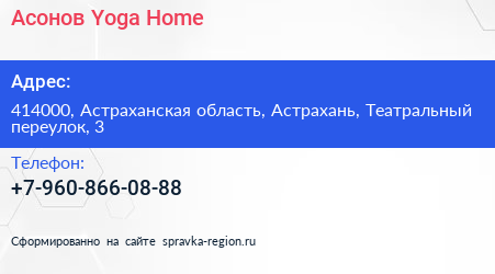 Асонов Yoga Home по адресу 414000, Астраханская область, Астрахань, Театральный переулок, 3 в дальнейшем Организация, размещена в следующих категориях: