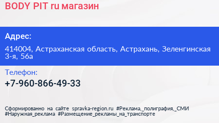 BODY-PIT.ru, магазин по адресу 414004, Астраханская область, Астрахань, Зеленгинская 3-я, 56а в дальнейшем Организация, размещена в следующих категориях: