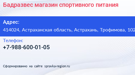 Бадразвес, магазин спортивного питания по адресу 414024, Астраханская область, Астрахань, Трофимова, 102 в дальнейшем Организация, размещена в следующих категориях: