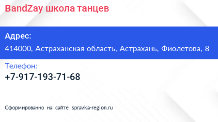 BandZay, школа танцев по адресу 414000, Астраханская область, Астрахань, Фиолетова, 8 в дальнейшем Организация, размещена в следующих категориях: