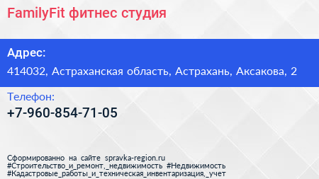 FamilyFit, фитнес-студия по адресу 414032, Астраханская область, Астрахань, Аксакова, 2 в дальнейшем Организация, размещена в следующих категориях: