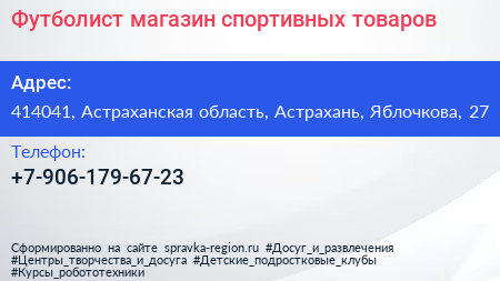Футболист, магазин спортивных товаров по адресу 414041, Астраханская область, Астрахань, Яблочкова, 27 в дальнейшем Организация, размещена в следующих категориях: