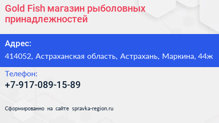 Gold Fish, магазин рыболовных принадлежностей по адресу 414052, Астраханская область, Астрахань, Маркина, 44ж в дальнейшем Организация, размещена в следующих категориях: