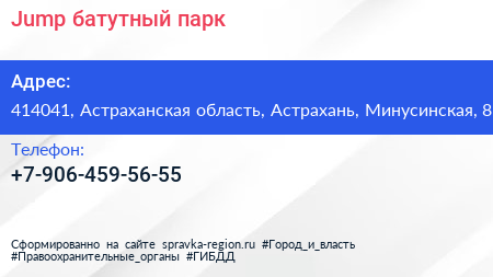 Jump, батутный парк по адресу 414041, Астраханская область, Астрахань, Минусинская, 8 в дальнейшем Организация, размещена в следующих категориях: