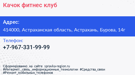 Качок, фитнес-клуб по адресу 414000, Астраханская область, Астрахань, Бурова, 14г в дальнейшем Организация, размещена в следующих категориях: