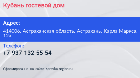 Кубань, гостевой дом по адресу 414006, Астраханская область, Астрахань, Карла Маркса, 12а в дальнейшем Организация, размещена в следующих категориях: