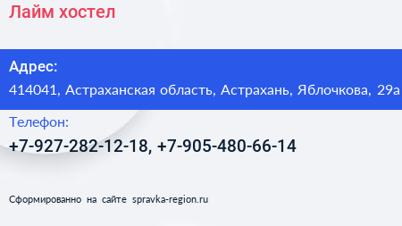 Лайм, хостел по адресу 414041, Астраханская область, Астрахань, Яблочкова, 29а в дальнейшем Организация, размещена в следующих категориях: