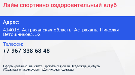 Лайм, спортивно-оздоровительный клуб по адресу 414016, Астраханская область, Астрахань, Николая Ветошникова, 52 в дальнейшем Организация, размещена в следующих категориях: