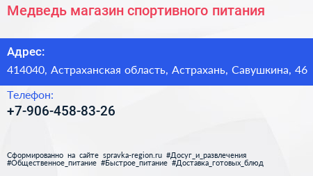 Медведь, магазин спортивного питания по адресу 414040, Астраханская область, Астрахань, Савушкина, 46 в дальнейшем Организация, размещена в следующих категориях: